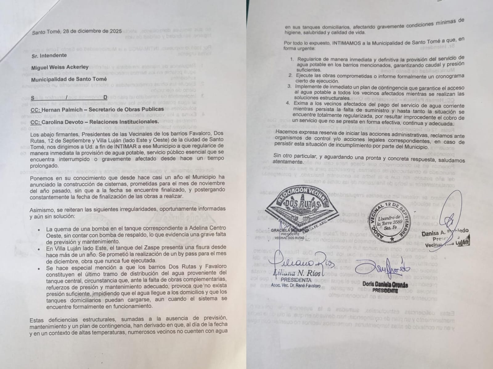 En la nota, las vecinales exigen que el Municipio regularice "de manera inmediata y definitiva el servicio", garantizando caudal y presión suficientes para las viviendas de la zona. También solicitan que se ejecuten las obras comprometidas o, en su defecto, se informe de manera formal un cronograma cierto de ejecución.