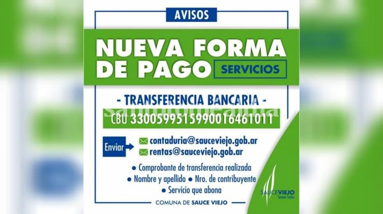 La Comuna de Sauce Viejo decidió poner a disposición de los vecinos la posibilidad de abonar los servicios por transferencia bancaria, ya sea a través de cajeros automáticos o por homebanking.
