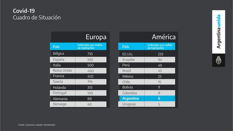 El Presidente hizo especial referencia al caso de Suecia y de Noruega. “Suecia tiene 14 muertes más que Noruega. En números relativos, Suecia tiene el doble de habitantes que Noruega. En muertos por cada 100 mil habitantes, Noruega tiene cuatro y Suecia 31. En cantidad de infectados, Suecia tiene 25 mil y Noruega 8 mil. Cuando a mí me dicen que siga el ejemplo de Suecia, la verdad lo que veo es que Suecia, con 10 millones de habitantes, cuenta 3.175 muertos por el virus. Es menos de la cuarta parte de lo que la Argentina tiene. Es decir que los que me están proponiendo, es que de seguir el ejemplo de Suecia, tendríamos 13 mil muertos”.