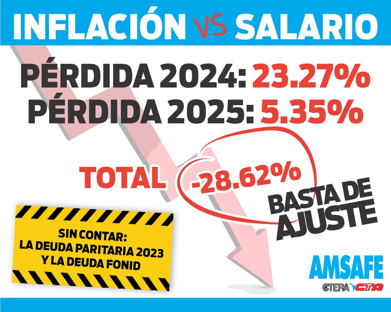 AMSAFE volvió a poner sobre la mesa los efectos del ajuste en el salario docente, esta vez con números concretos. El gremio presentó este lunes un informe gráfico basado en datos oficiales del Instituto Provincial de Estadística y Censos (IPEC), que confirma una pérdida del 28,62 % del poder adquisitivo de los trabajadores de la educación entre enero de 2024 y septiembre de 2025.