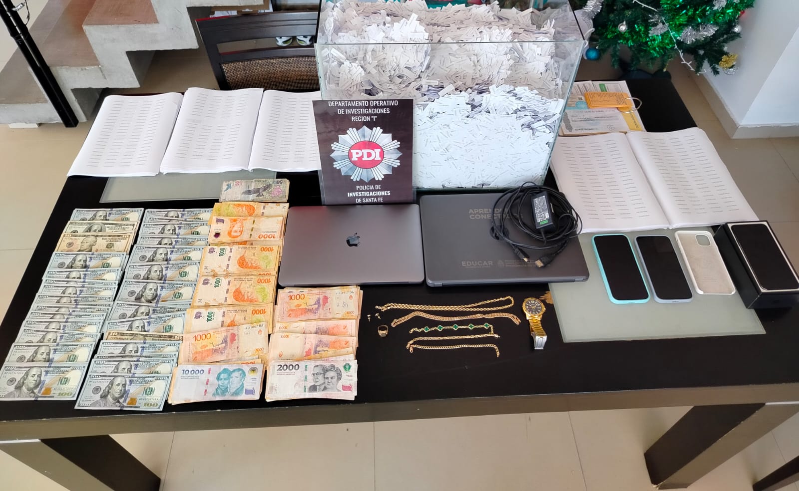 Durante los allanamientos se secuestró un automóvil marca Peugeot, USD 7.385, $187.000 en efectivo, una urna transparente con numerosos papeles numerados, notebooks, celulares, joyas, un reloj marca Casio y diversa documentación de interés para la causa.